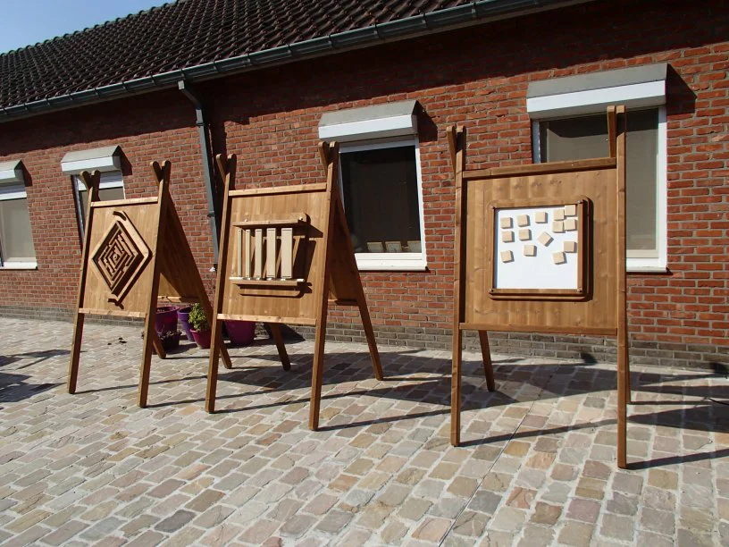 De speelpanelen zijn verplaatsbaar en verwisselbaar. We maakten magnetische panelen (voor knikkerbanen en memory spel) draaiende panelen en enkele 'voelpanelen'.