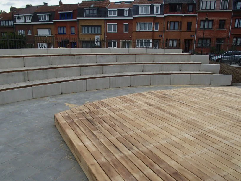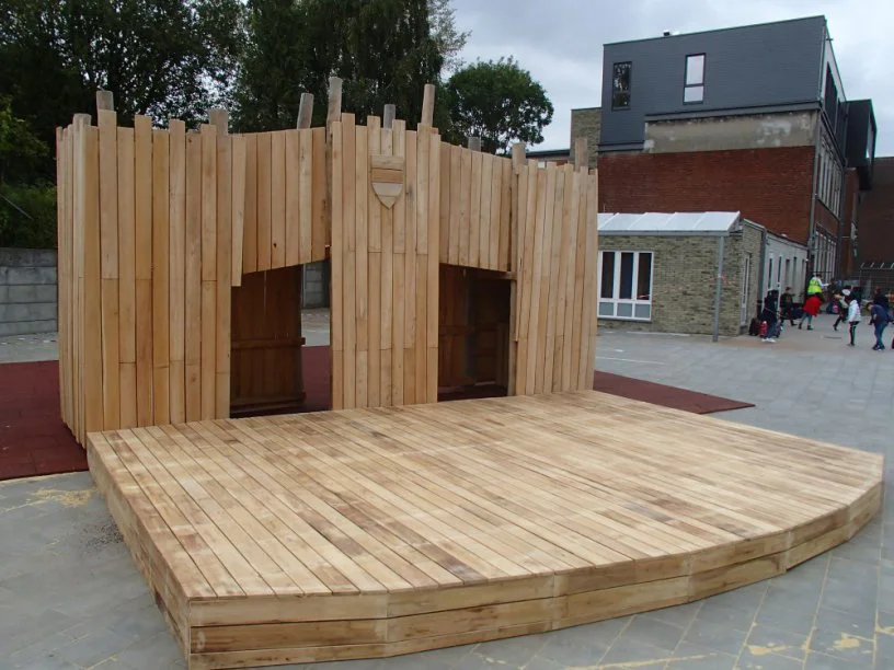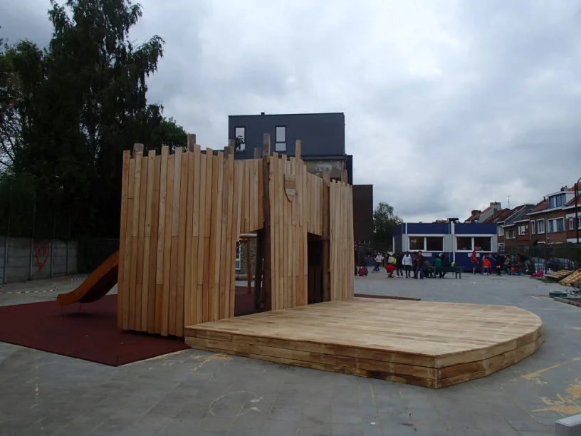 Op de speelplaats van Leo XIII in Brussel zijn we volop bezig aan de vernieuwing van de speelplaats. In een eerste fase bouwden we de tribune en het enorme speelkasteel. Dit kasteel is aan de voorkant het 'decor' van het podium. Aan de achterkant en binnenin is het een klim en klauterbouwsel met klimmuur, glijbaan, klimnet enz. binnenin het kasteel kan je via de twee buitenste torens naar boven. De vloerhoogte van de middelste toren is 200 cm.