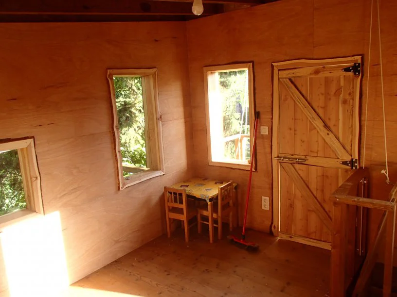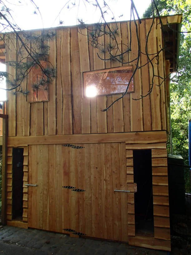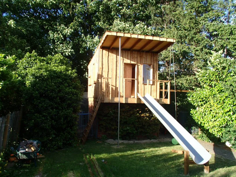 De familie Sneyers vroeg me een 'boomhut'/speelconstructie te bouwen op een oud hondenhok. De hut is uiteindelijk 3 op 3.5 meter geworden met een uitstekend terras, met inox brandweerpaal, takelsysteem en een glijbaan van een enorme pvc rioolbuis. Onder de hut zijn nog een berghok voor tuinmaterialen en de garage voor de Go-Kart met een geheime ingang via een luik in de grond.