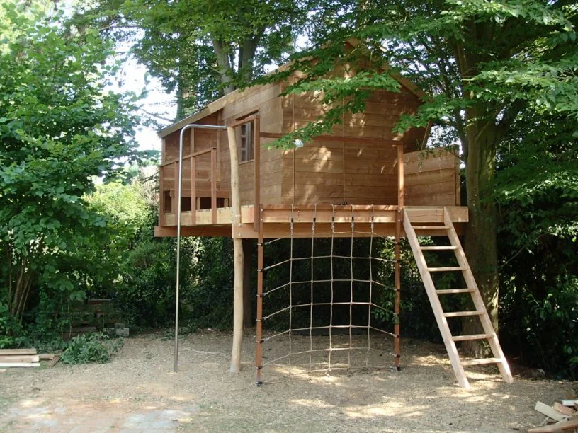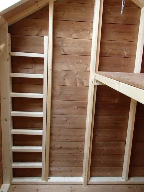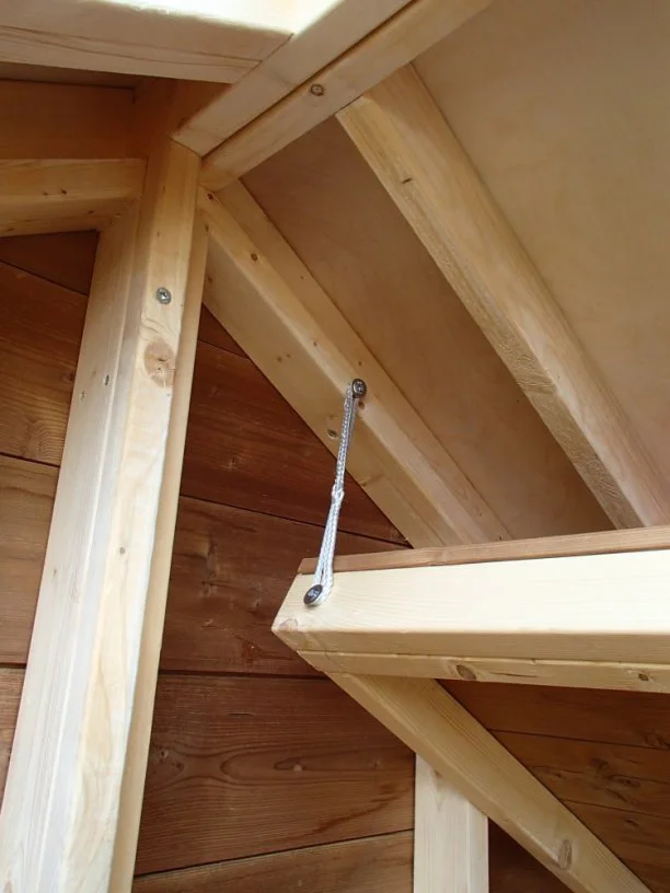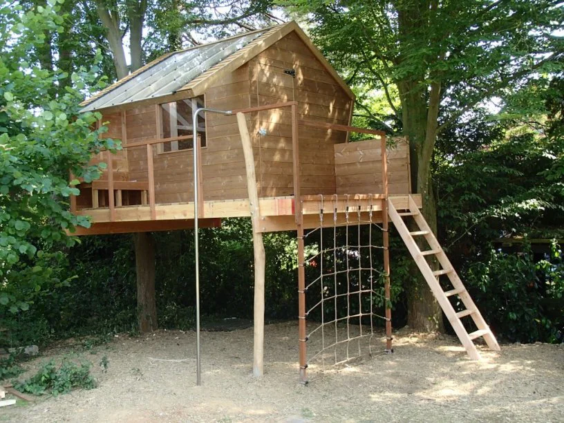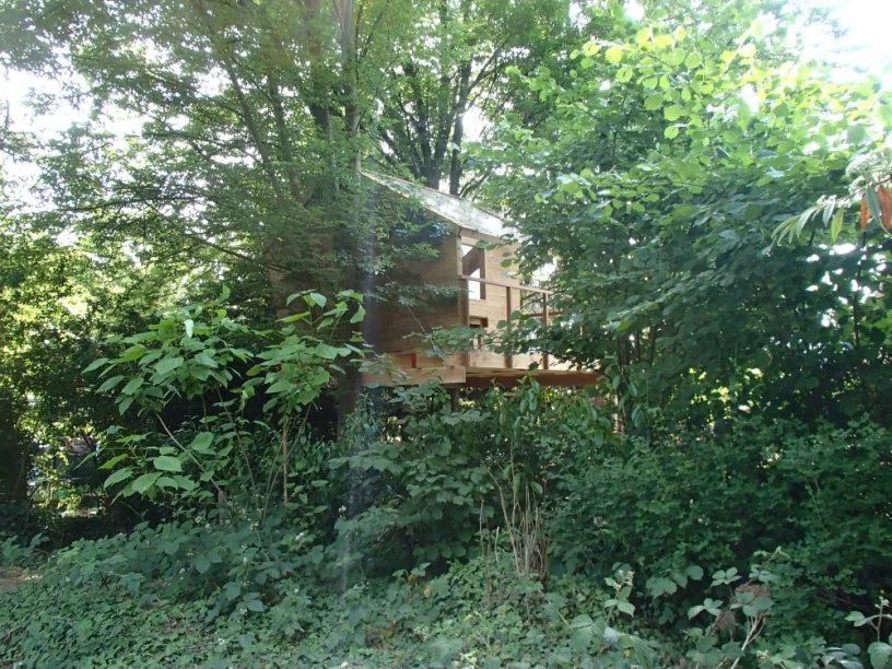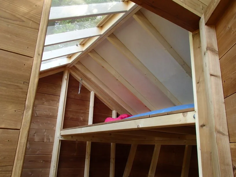 Deze boomhut met opklapbare mezzanine staat in een achtertuin in Leuven. Met name het grote glazen dak springt in het oog. Dit zorgt ervoor dat er voldoende licht binnenkomt terwijl de boomhut 'verstopt' zit in de bosjes. De mezzanine is groot genoeg voor twee volwassenen. Met klimnet brandweerpaal.