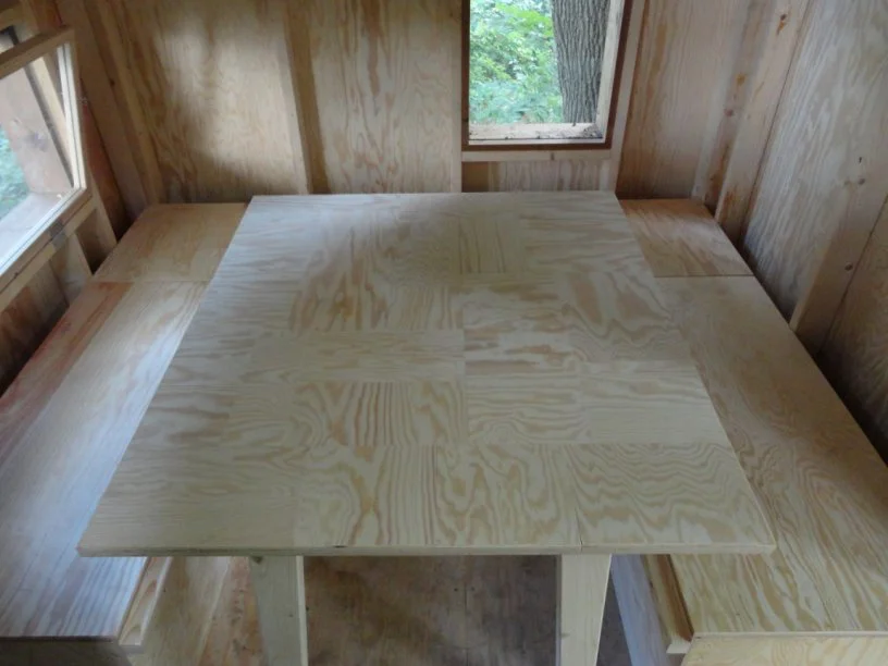 Deze ruime boomhut steunt op boomankers en hangt aan kabels op 3 meter hoogte tussen een eik en een kersenboom. De hut van 6m² beweegt zachtjes in de wind. De zithoek kan worden omgebouwd tot slaapruimte. Het terras aan de voet van de hut is 12m² en de perfecte plaats om in het groen te met het hele gezin te genieten. Materalen: Douglas, thermowood, en grenen multiplex.