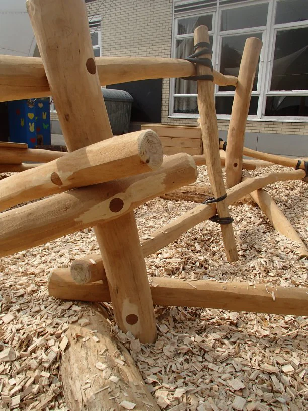 Deze expres 'half-affe' constructie geeft de kinderen de mogelijkheid om zelf aan de slag te gaan met houten planken, palen en rubber spanbanden. Zo bouwen ze kampen, bruggen, vloertjes enzovoort. De vierde bak maakt het mogelijk om de gebruiksmaterialen terug op te bergen.