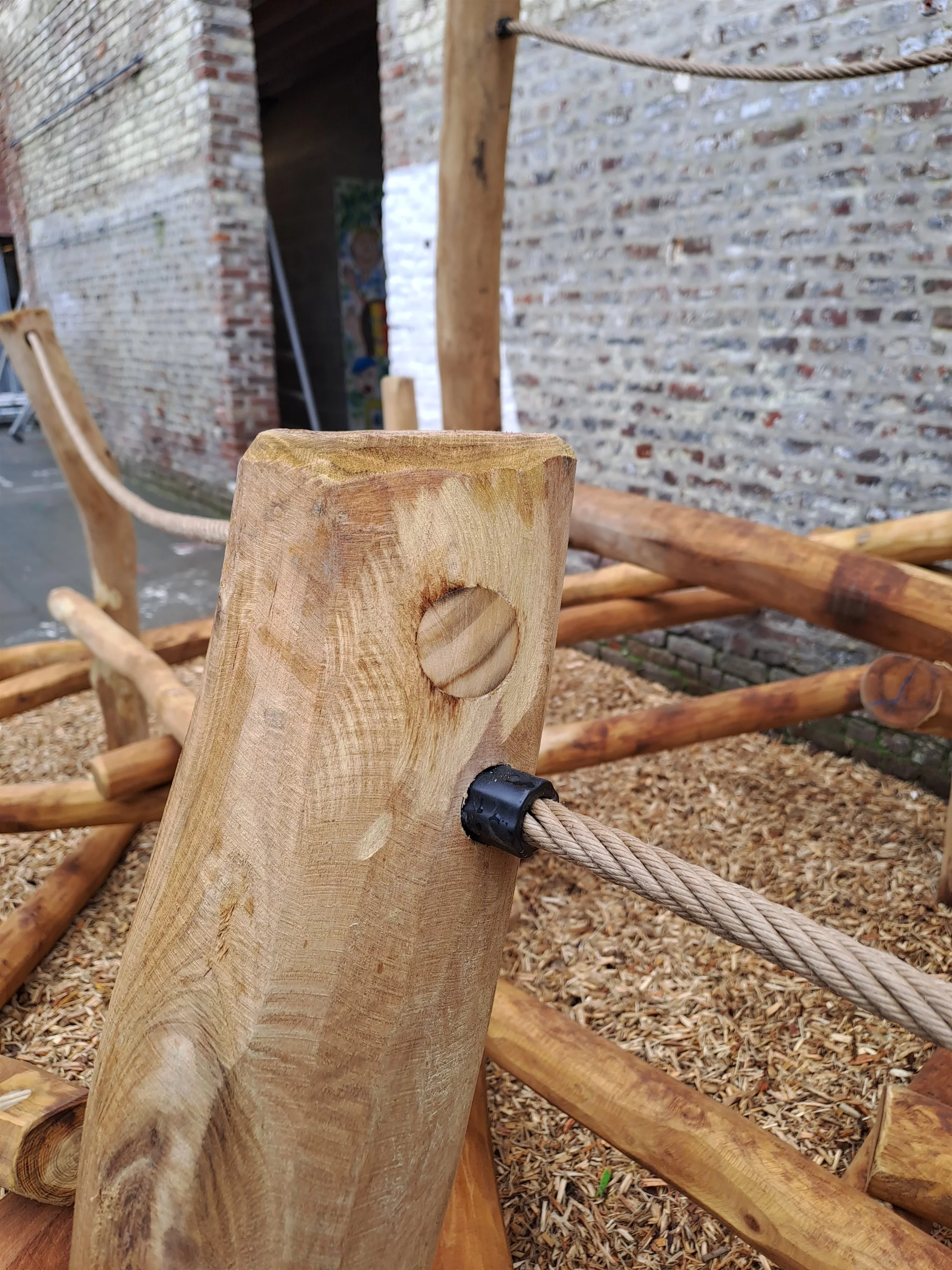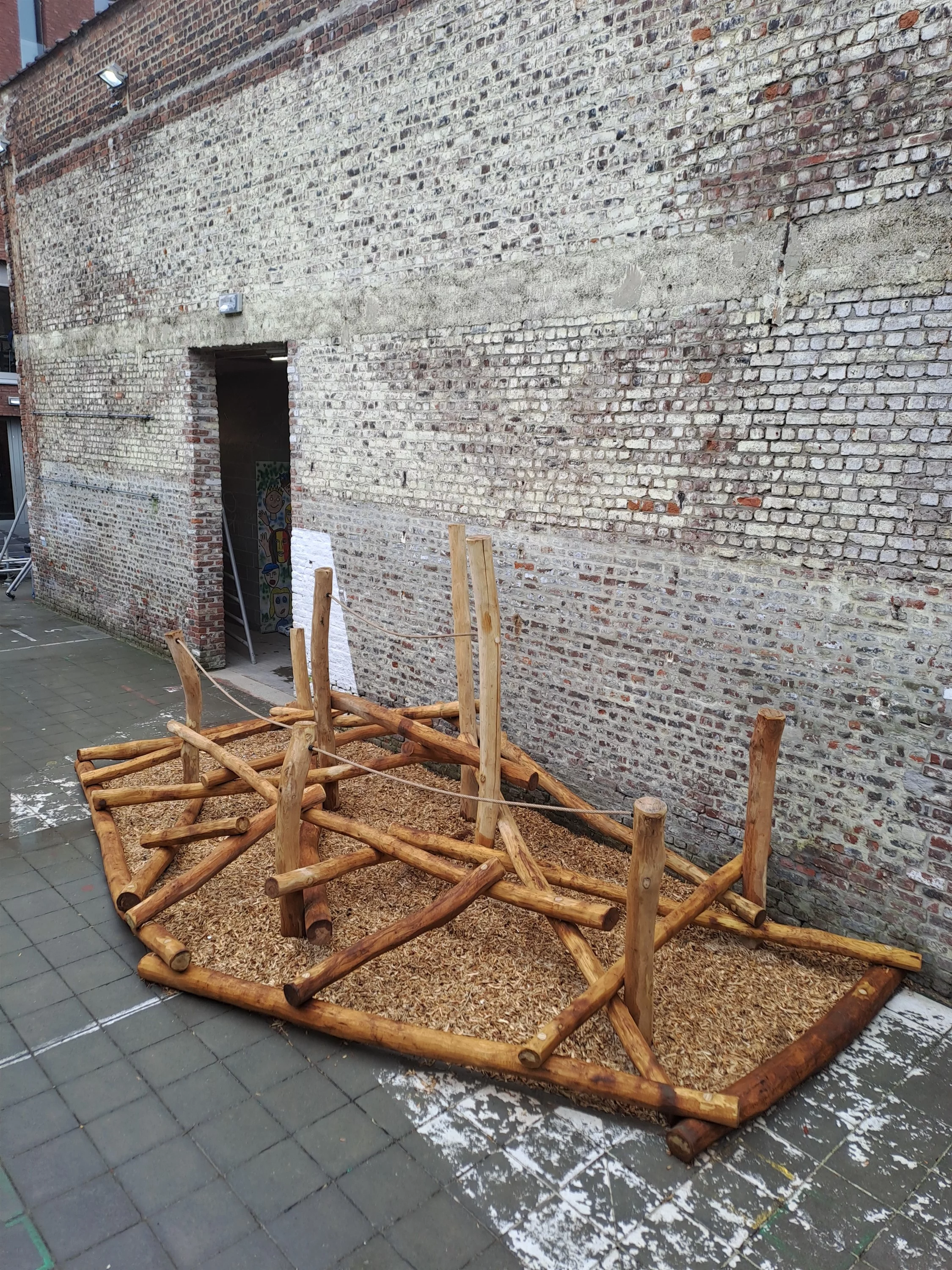 Alles volledig in Robinia stammen, planken en schaaldelen. Voor de aandachtige kijker, Ja dat mag, een klauterbouwsel op deze manier plaatsen op beton. Als de valhoogte en valruimtes gerespecteerd worden, kan dat perfect. Ook op een kleine afgebakende zone kan je op een veilige manier actief spel uitlokken.