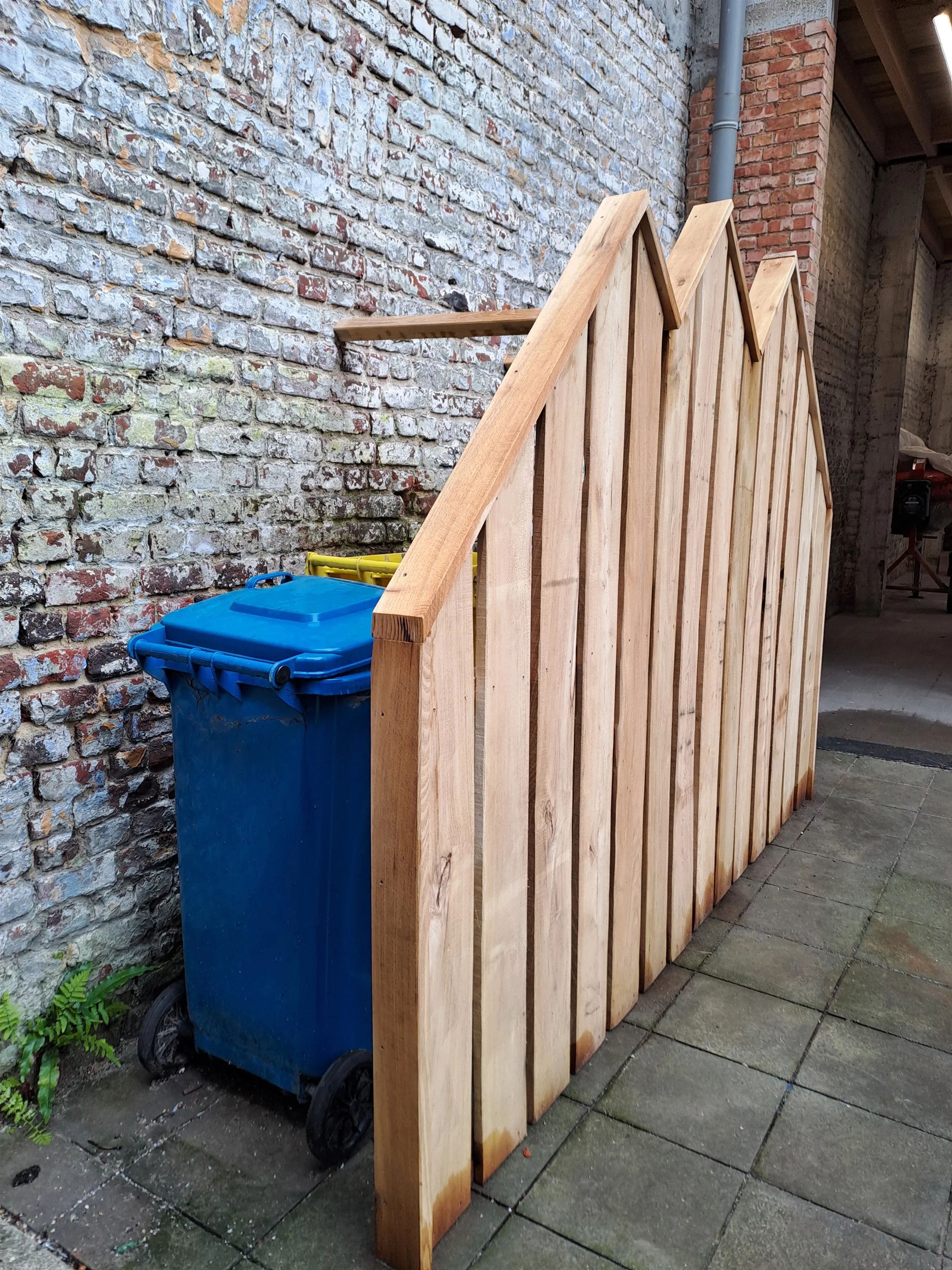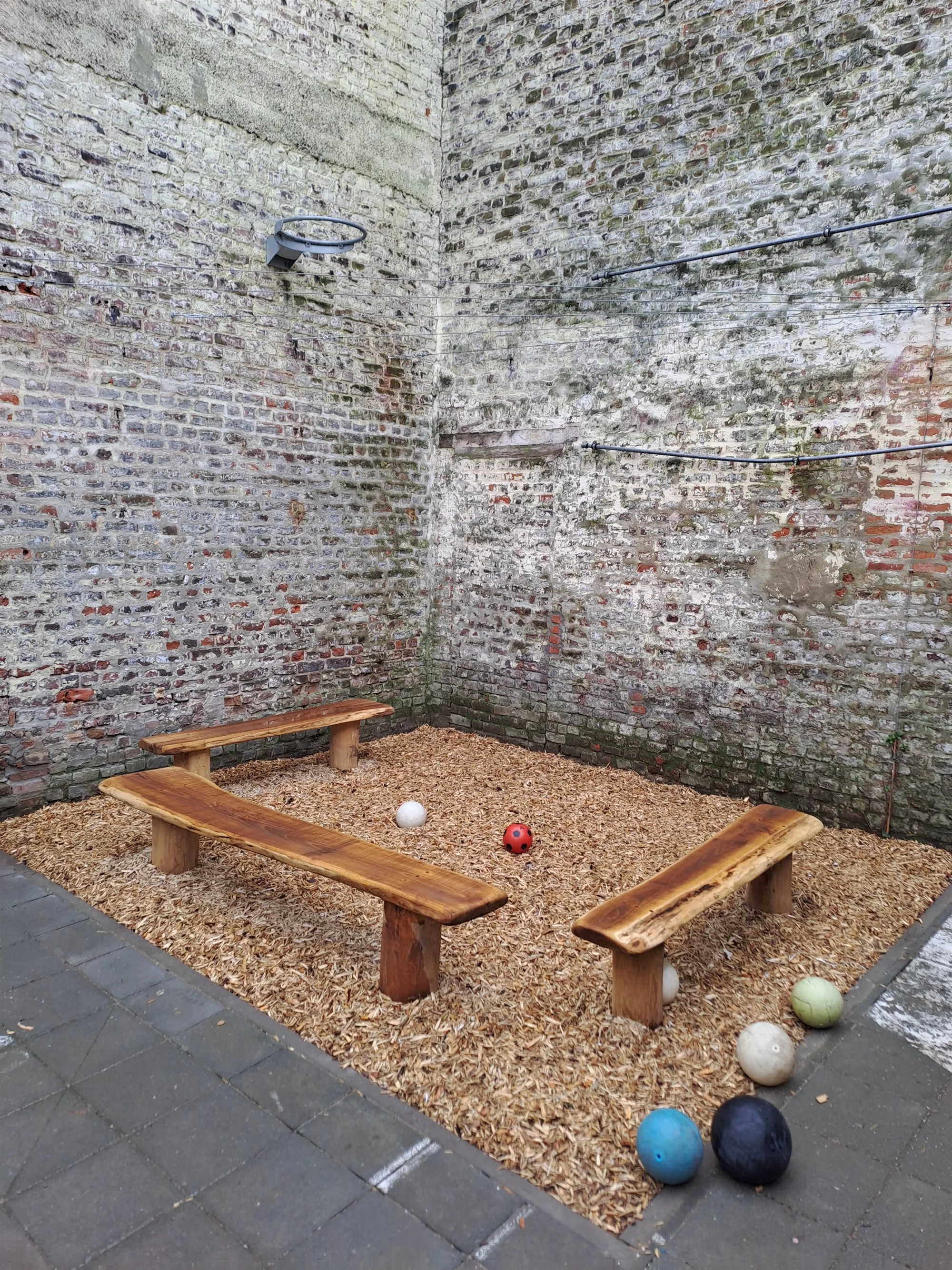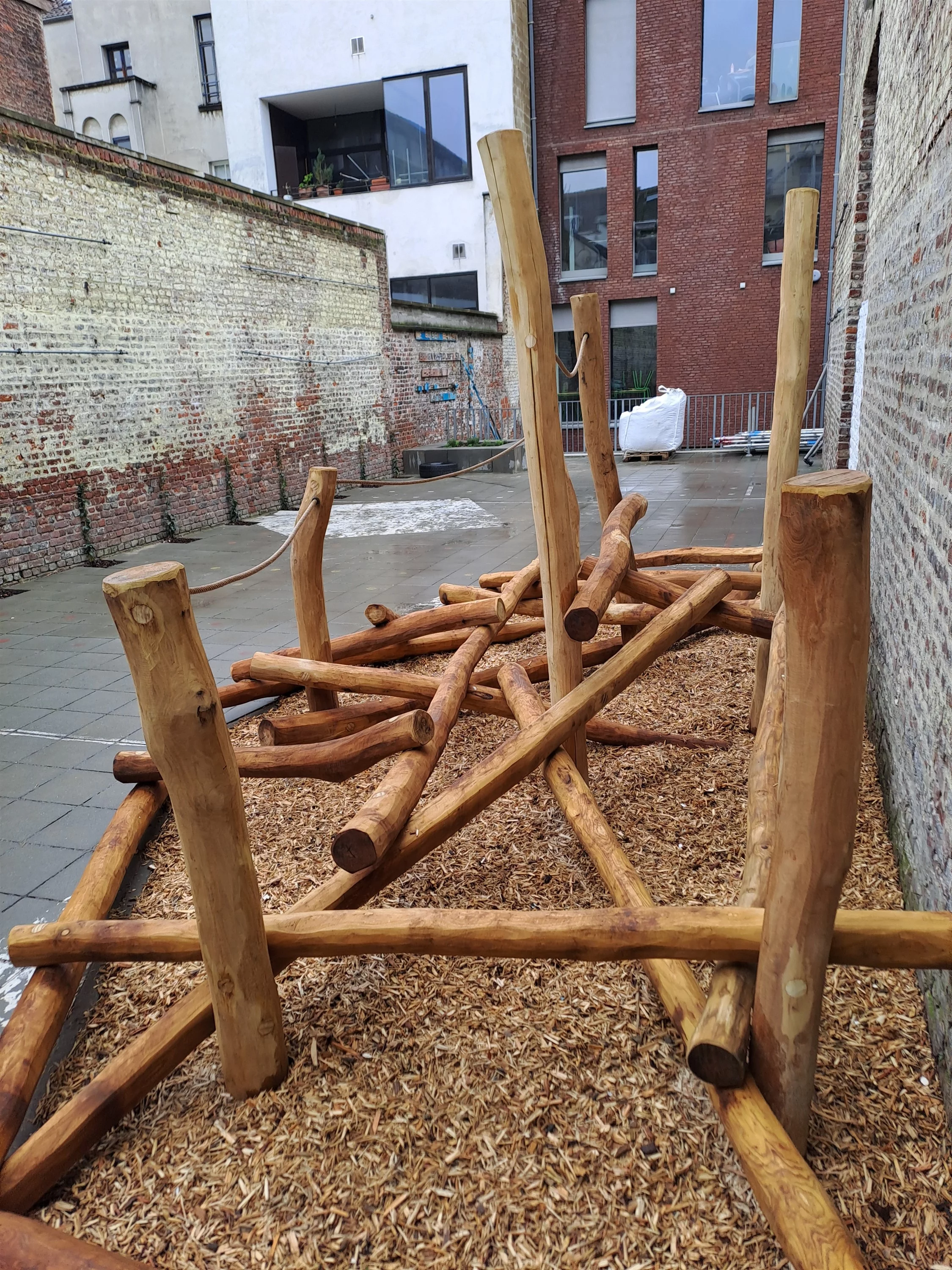 Vlak bij het zuid station van Brussel bouwden we een aantal houten bouwsels. Op deze kleine ingesloten speelplaats realiseerden we een klauterbouwsel, een rustige zithoek en een afscheidingswandje voor de vuilbakken.