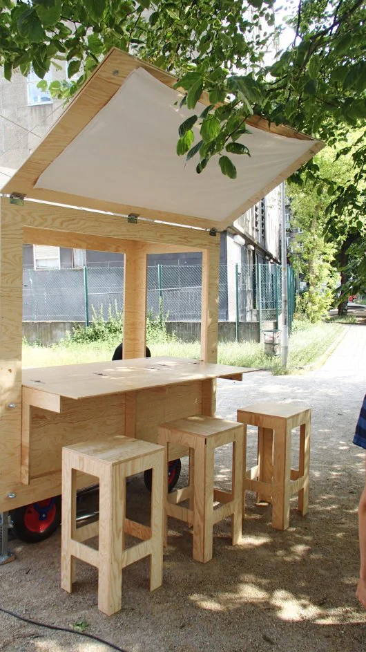 Voor de opleiding sociaal werk van de Brusselse universiteit hogeschool Odisee, bouwde ik de Insjalet. Een verrijdbare ontmoetingsplaats die wordt ingezet voor 'digital storytelling'. De constructie klapt uit met 4 grote luifels, een bar, met 3 krukken, 3 tafeltjes met 6 krukjes een zitgedeelte, opbergruimte, koelkast en een beamer met projectiescherm.