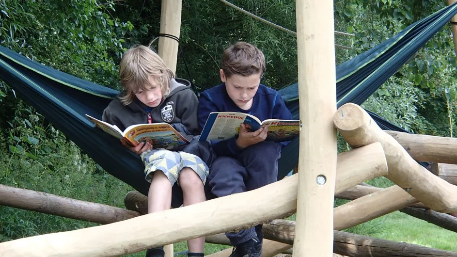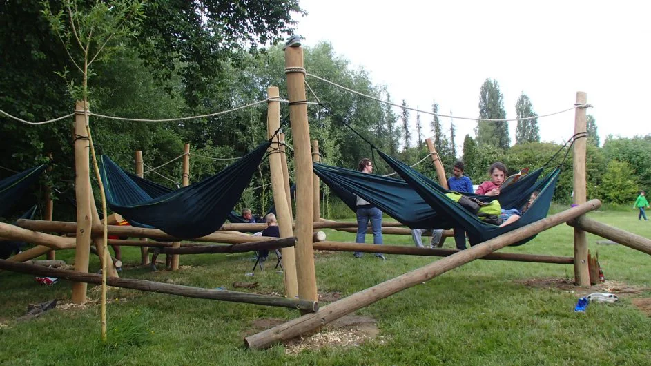 In opdracht van jeugd en gezinsboerderij Het Neerhof bouwde ik dit bouwsel. Ze vroegen me een ontmoetingsplaats/speelelement te bouwen dat ook kon dienen als overnachtingplaats voor klasse groepen. Deze opstelling van palen is hoefijzervormig met in het midden een vuurplaats. Tussen de palen kunnen een 20-tal hangmatten worden gehangen die het klimrek omtoveren tot originele kampplaats. De kinderen hangen in trossen naast en boven elkaar, de klimtouwen boven de hangmatten kunnen nu worden gebruikt op zeildoeken te spannen zodat iedereen ook draag kan slapen.